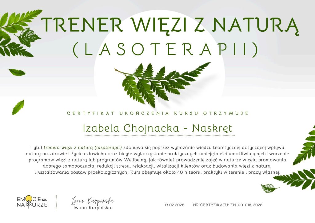 W trakcie prowadzenia sesji korzystam z moich kompetencji coachingowych, zachęcam do introspekcji i tworzę atmosferę akceptacji. Łączę praktykę Shinrin Yoku z wiedzą z zakresu pracy z emocjami, redukcji stresu i uważnej komunikacji, dzięki czemu uczestnicy nie tylko doświadczają kontaktu z naturą, ale też lepiej rozumieją swoje potrzeby i uczą się, jak wracać do wewnętrznej równowagi w codziennym życiu.